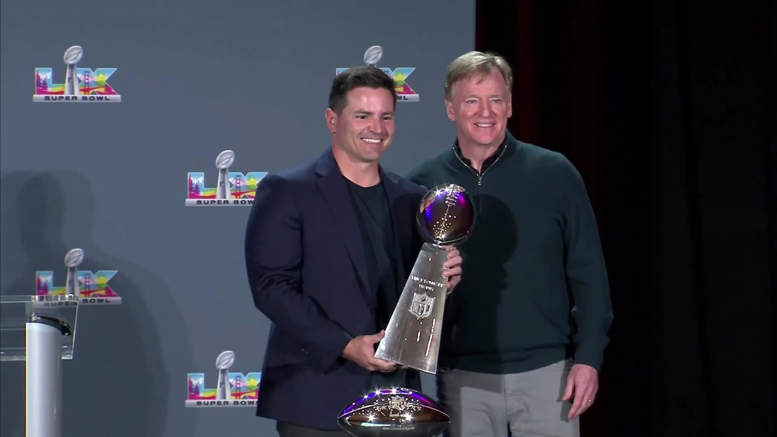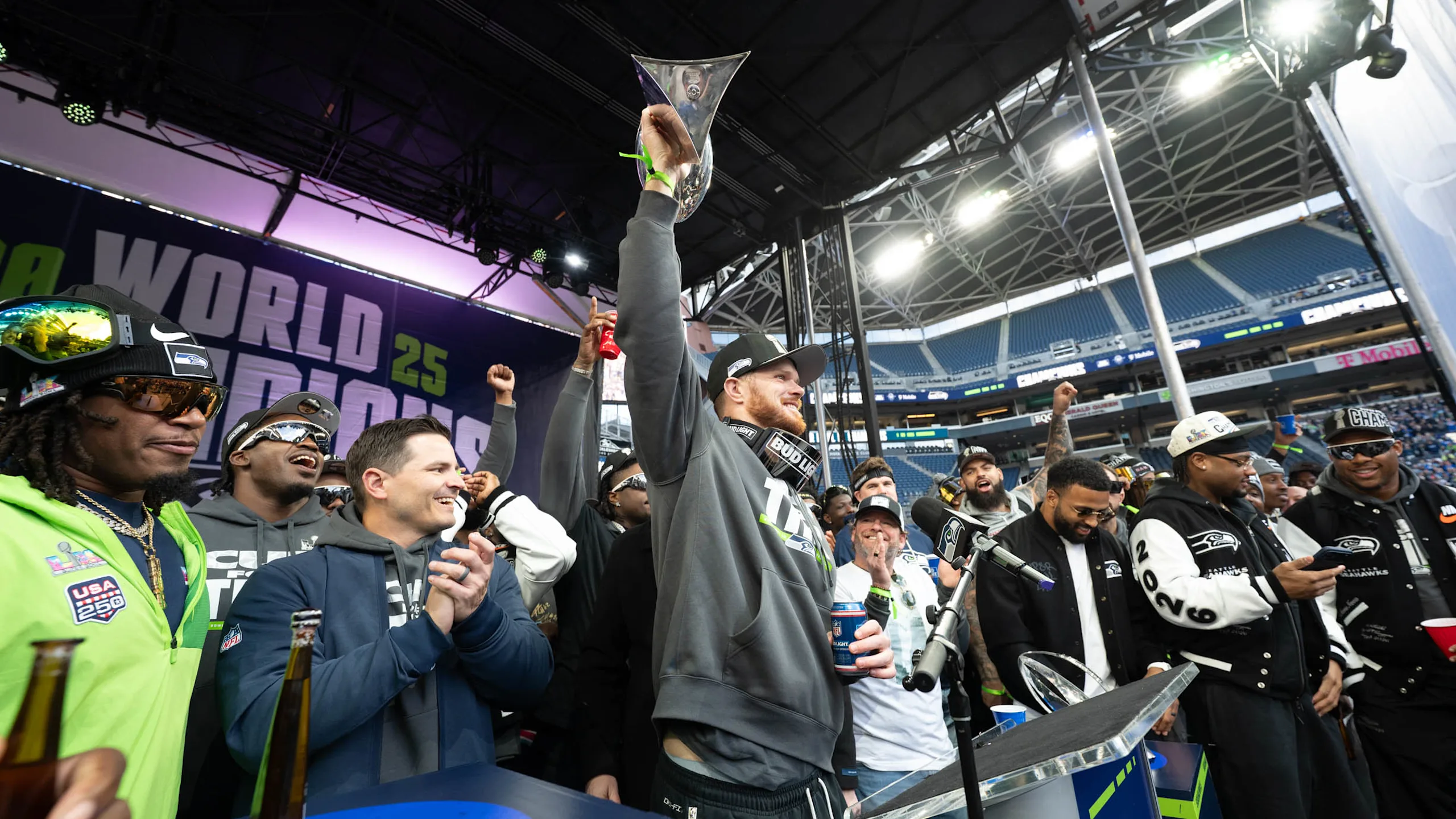 Los jugadores de los Seahawks subieron al escenario para la ceremonia del trofeo Lombardi el miércoles 11 de febrero de…