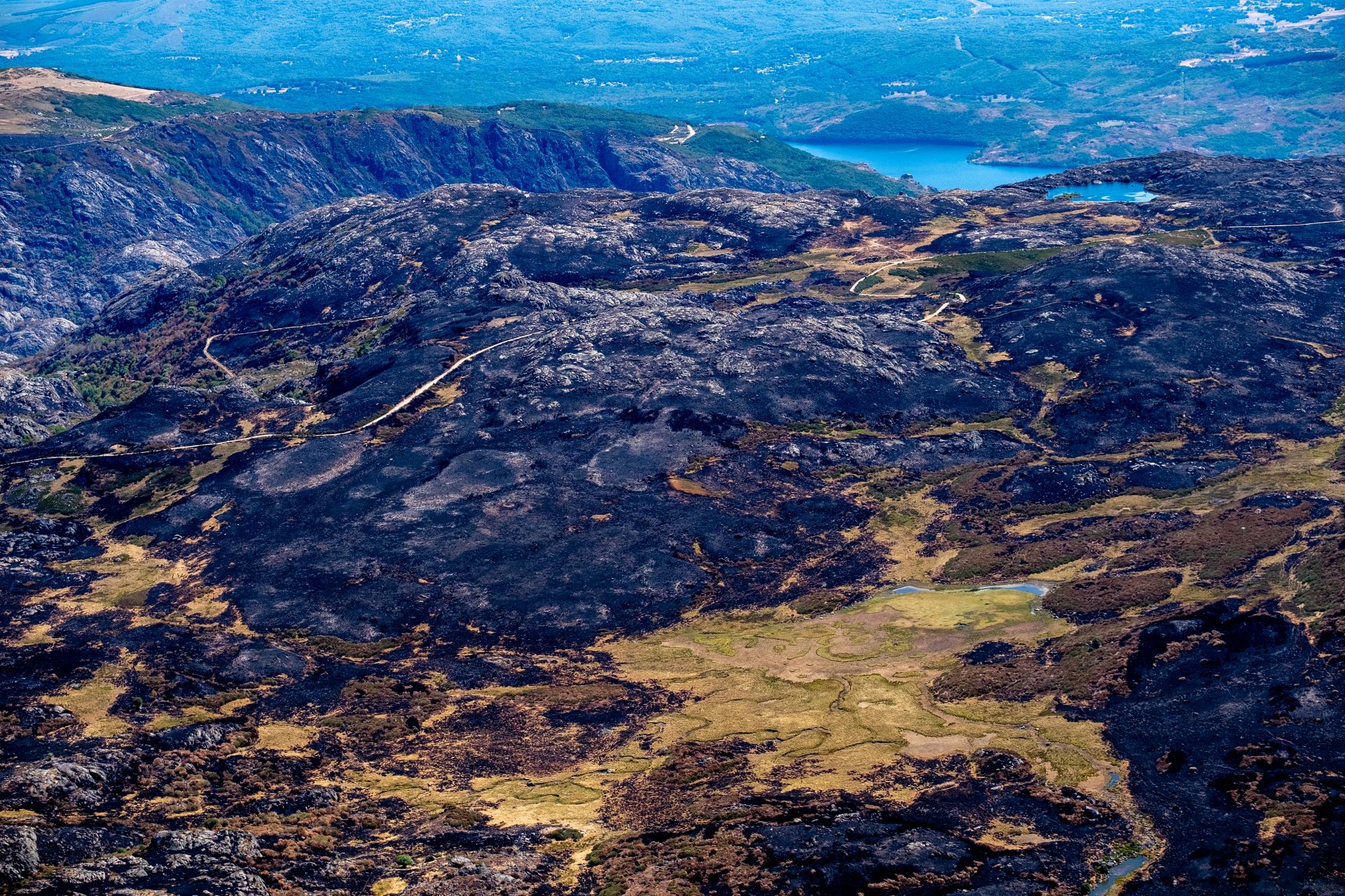 Las imágenes muestran retratos inéditos de suelos calcinados: casas con techos destruidos rodeadas de ceniza, espacios protegidos reducidos a manchas negras y antiguos santuarios ecológicos arrasados. Entre ellos, puntos que no habían sido fotografiados hasta ahora como la Serra do Courel, el Parque Natural de O Invernadeiro o la parroquia de Parafita, que hace parte de la Red Natura 2000.