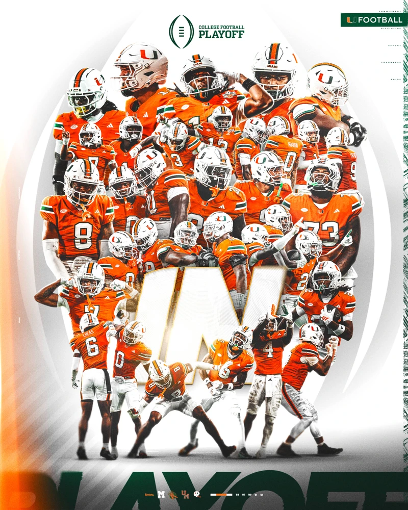 “Estamos entusiasmados por nuestra primera participación en el Playoff de Fútbol Americano Universitario”, declaró el vicepresidente y director de atletismo, Dan Radakovich. “Felicitaciones a Mario Cristóbal, a nuestro cuerpo técnico y a nuestros estudiantes-atletas por una excelente temporada regular, merecidamente recompensada por el Comité del CFP. Esperamos enfrentarnos a Texas A&M en la primera ronda y sé que la afición de Miami se hará sentir en College Station”.
